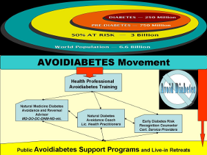Avoidiabetes Movement - Recognize Risk EarlyOne in two individuals worldwide is at risk of developing diabetes or metabolic disease during their lifetime and at great socio-economic cost. Research identifies over fifty health conditions as early risk indicators for diabetes. Avoiding diabetes is possible - eight to fourteen years before a possible diagnosis - naturally and without major costly interventions. But patients are on their own. The Avoidiabetes movement aims to develop worldwide satellite systems of specialized Early Diabetes Risk Recognition and Avoidance health professionals. In addition, we are developing a system of public live-in centers teaching meal preparation, food shopping, and Avoidiabetes lifestyle management. by: Rivkah Roth | Aug 2, 2010