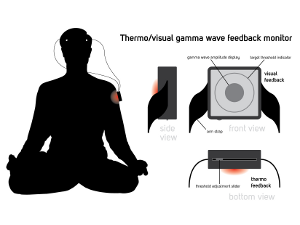 Thermo/visual gamma wave feedback monitorStress is implicated across the board as a driver of poor health. Meditation has been shown to be an effective way to reduce stress. Gamma waves (around 40 Hz) have been shown to be produced by seasoned meditators. Thus, a gamma wave feedback monitor may help a beginning meditator to know when they are producing higher amplitude gamma waves. Sensors are attached to the forehead. The monitor is worn on the arm. Feedback is indicated by gentle heating when a user-set threshold has been reached. There is also a visual indicator for use by a friend, guide, or coach. by: Jody Radzik | Jun 24, 2010